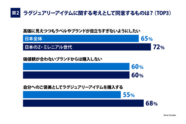 また、ラグジュアリーアイテムに関する考え方としても、日本は「高価に見えつつもラベルやブランドが目立ちすぎないようにしたい(65%)」、「価値観が合わないブランドからは購入しない(60%)」が上位になるなど、 他人に誇示することを目的としない、自身の価値観を尊重する「クワイエット・ラグジュアリー」を重視する傾向が見られました。【図2】