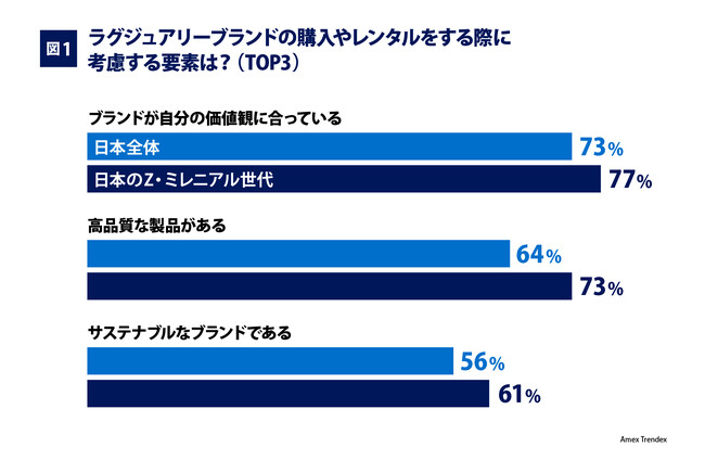 日本ではラグジュアリーアイテムの購入やレンタルをする際に考慮する要素TOP3として、「ブランドが自分の価値観に合っている(73%)」、「高品質な製品である(64%)」、「サステナブルなブランドである(56%)」となっており、特にZ世代・ミレニアル世代では、その傾向がより強いことが分かりました。【図1】