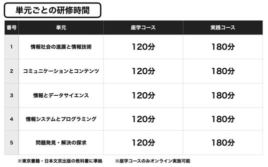 基礎を学ぶ「座学コース」と実際に手を動かしながら理解を深める「実践コース」の2つのコースを用意し、例えば、「情報社会の進展と情報技術」の単元は座学コース、「情報とデータサイエンス」の単元は実践コース、というように、単元ごとにコースを組み合わせて受講することが可能です。