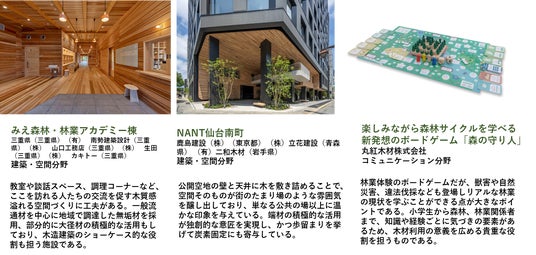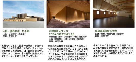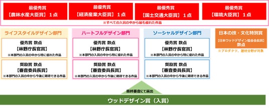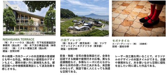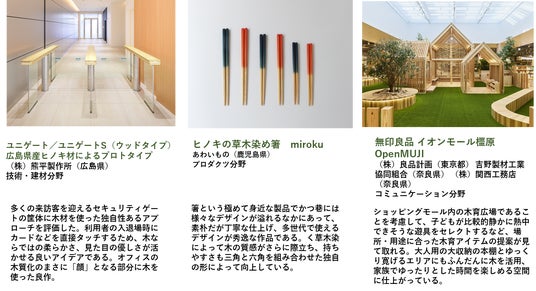 最優秀賞として「農林水産大臣賞」「経済産業大臣賞」「国土交通大臣賞」「環境大臣賞」の4作品、優秀賞(林野庁長官賞)、奨励賞(審査委員長賞)、さらに昨年までの大阪・関西万博特別賞の流れを汲み、「日本の技・文化特別賞」が選出されました。