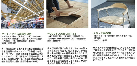 ■応募対象分野:建築・空間、技術・建材、プロダクツ、コミュニケーション、調査・研究等、木に関するあらゆるモノ・コトが対象