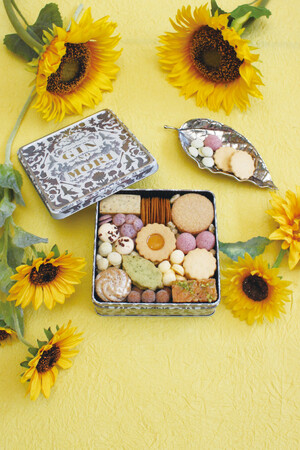 夏季限定クッキー缶【プティボワ 150 Summer】は、ひまわりの種と杏のジャムでつくった一際目を引くひまわりのクッキーを中心に、カラフルで個性豊かな15種類の焼き菓子が仕切りなく敷き詰められています。