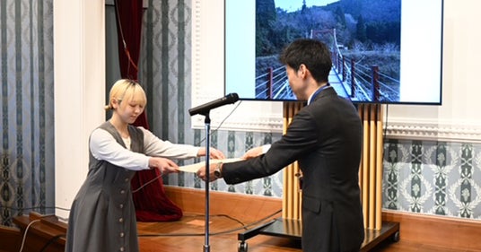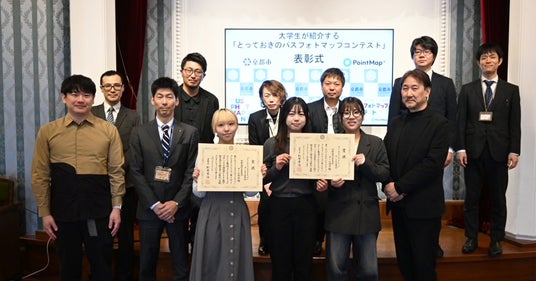 応募作品の中から、マップのテーマ性や写真の芸術性などの評価基準に基づき、優秀作品2点が選定され、京都市役所本庁舎にて表彰式が行われました。