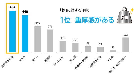 鉄に対する印象を聞く質問では、「重厚感がある」「強そう」が上位にランクイン。鉄は重量があり頑丈な印象が強い金属素材ですが、昨今では技術進歩により軽量化も進んでおり、強度を保ちつつ軽量な鉄素材も増えています。