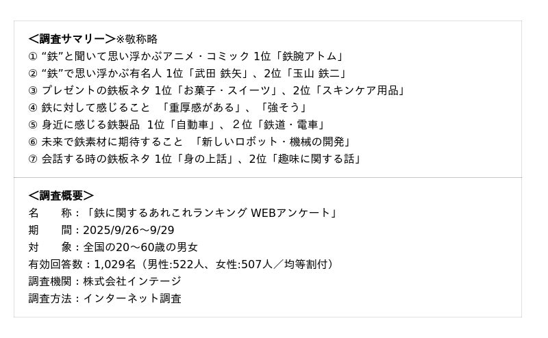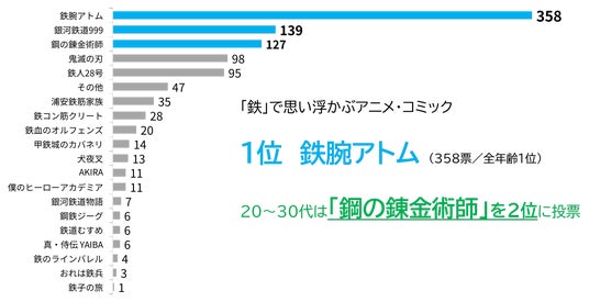 “鉄”と聞いて思い浮かぶアニメ・コミックを聞いたところ、ロボットアニメとして絶大な人気を誇る「鉄腕アトム」が全年齢で1位(358票)となりました2位には「銀河鉄道999」(139票)、3位には「鋼の錬金術師」(127票)がランクインし、20~30代の世代別ランキングでは「鋼の錬金術師」が2位にランクインしています。タイトルに「鉄」が入っていない作品ではキャラクター名や、ストーリーから「鉄」を想起する人が一定数いることが分かりました。
