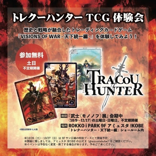 株式会社ゼクサバース(本社:東京都千代田区、代表取締役:上瀧 良平、以下「ゼクサバース」)は、ROKKO i PARK(所在地︓ 兵庫県神戸市)のアミュスタ! KOBEで開催する『武士(モノノフ)展 ~諏訪原寛幸(すわはらひろゆき)が魅せる戦国の世界~』の関連イベントとして、限定NFTや武将カードが入手できる「トレクーハンタークエスト」や、現在発売中の武将トレーディングカードゲームの体験会を開催します。