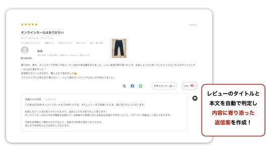レビューひとつひとつに丁寧に向き合っていることが伝わるコメントが提案されるので、他の閲覧者にも誠実な対応をしている印象を与えることができ、ブランドイメージの向上にもつながっていると感じています。