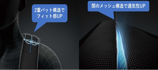 ショルダーベルトの分割設計で荷重を分散。肩にフィットしやすい角度設計と連動し、軽量感を生み出すことで、身体への負担を軽減します。(※ミズノ従来品比)