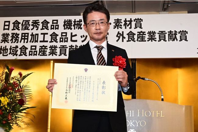 今年は業務用加工食品ヒット大賞を1社、業務用加工食品ヒット賞を12社が受賞し、贈呈式では受賞各社へ株式会社 日本食糧新聞社 代表取締役会長CEOの今野 正義氏から表彰状が授与されました。