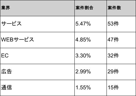Scala案件はサービスが5.47%(53件)で最多となり、WEBサービスが4.85%(47件)、ECが3.30%(32件)、広告が2.99%(29件)、通信が1.55%(15件)と続き、上位5業界で約18%を占めています。
