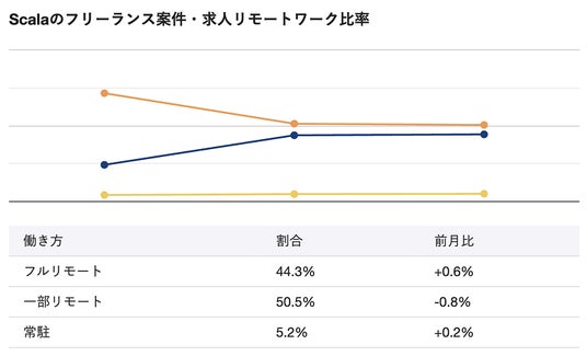 2025年6月時点のScalaフリーランス案件・求人におけるリモートワーク比率は、フルリモートが44.3%、一部リモートが50.5%、常駐が5.2%です。フルリモートは前月比+0.6%増加、一部リモートは-0.8%減少した一方、常駐は+0.2%増加しています。