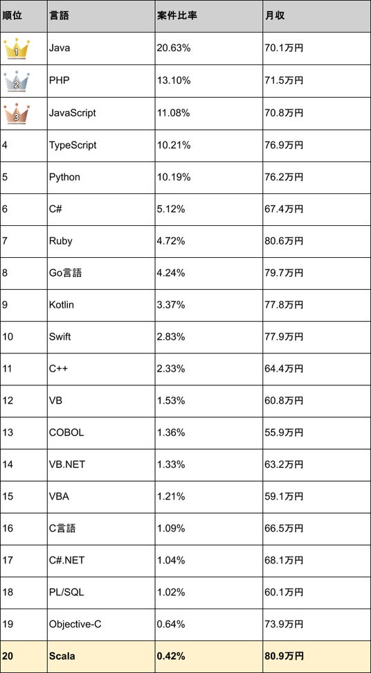 Scalaスキルはクラウドネイティブ高負荷システムの重要な技術として極めて高い市場価値を持ちます。本調査では平均年収977万円で言語別2位、案件比率0.42%で20位と希少性と報酬の両方で際立っています。