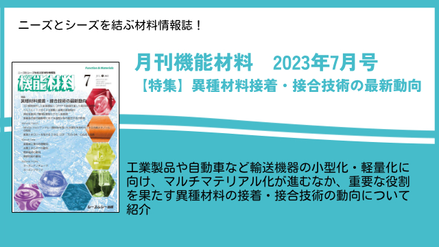化学・電子工学などの技術・市場動向レポート発行やセミナー開催を行う、株式会社シーエムシー出版(本社:東京都千代田区、代表:辻賢司)は、雑誌『月刊機能材料2023年7月号』を7月7日に発売しました。特集は「異種材料接着・接合技術の最新動向」です。工業製品や自動車など輸送機器の小型化・軽量化に向け、マルチマテリアル化が進むなか、重要な役割を果たす異種材料の接着・接合技術の動向について紹介しています。