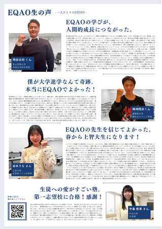 娘がこちらの塾で3期生としてお世話になりました。 1年前までは自分の将来像が見えず、進路についてかなり悩み、時には自暴自棄な態度もしばしばあった状態でした。そこで一般入試対策と並行して総合型選抜入試も視野に入れて対策をしていこうと本人とも話し、EQAOへの入塾を決めました。EQAOを選んだ理由として、他塾とも比較しましたが企業理念が素晴らしかったことと、まだ開校3年目ながら先生方の本気度が伺えたこと、費用的にも安価で対応いただけるということが挙げられます。行きたい大学も無い状態で入塾しましたが、先生方が親身になって娘のインサイトを引き出し、Visionを可視化していただくことによって、娘の受験に対する行動も日を追うごとに変化していきました。
