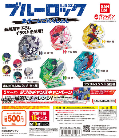株式会社バンダイ ベンダー事業部(本社:東京都台東区)は、TVアニメ『ブルーロック』の新規描き下ろしイラストを使用したアクリルスタンドとホログラム缶バッジのアソート『ブルーロック あそーとこれくしょん』(1回500 円・税10%込、全10種)を2023年8月第2週目より順次全国のガシャポンバンダイオフィシャルショップ、玩具売場、量販店、家電店などに設置されたカプセルトイ自販機にて発売し、本商品の発売を記念して、抽選で100名様に「アクリルビジュアルボード」が当たる「ガシャポン ダブルチャンスキャンペーン」を開催しております。