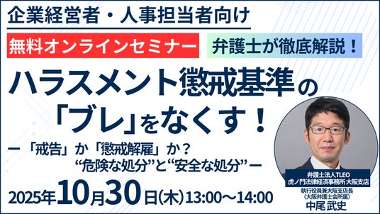 今回、弁護士法人TLEO虎ノ門法律経済事務所では、「ハラスメント懲戒基準の「ブレ」をなくす!-「戒告」か「懲戒解雇」か?“危険な処分”と“安全な処分”」をテーマにオンラインセミナーを実施いたします。