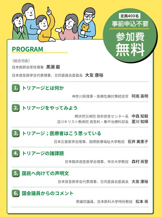 本市民公開講座は、日本医師会、日本臨床救急医学会、日本災害医学会、日本救急医学会で組織している「災害時のトリアージに関する合同委員会」が企画したもので、災害時のトリアージには不確実性があることについて理解を求めるとともに、医療者を守る法的・制度的な整備を国に申し入れていくことなどを目的として開催するものです。