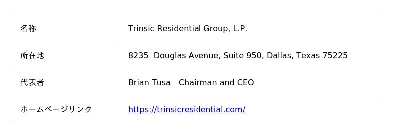 TRG社は、米国テキサス州ダラスを拠点に、人口および雇用が急増するサンベルト地域(北緯37度以南)を中心とした6州で賃貸集合住宅の開発事業を展開するデベロッパーです。同社は、土地情報の収集から許認可取得、資金調達、建設、アセットマネジメント、売却まで、賃貸集合住宅事業に必要な一貫体制を確立しており、当社グループ事業との高い親和性を有しています。