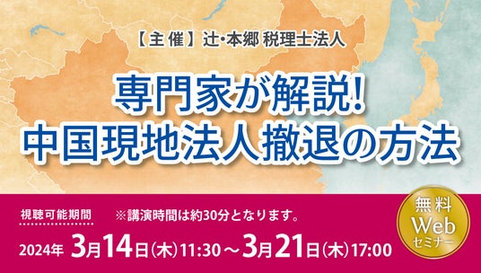 辻・本郷 税理士法人(本社:東京都新宿区、理事長:徳田孝司)は、2024年3月14日(木)より「専門家が解説! 中国現地法人撤退の方法」セミナーを開催いたします。中国で事業展開してきた日本企業は大きな転換点に立たされています。撤退を検討している企業も増えており、今最も注目すべきテーマの一つとなっています。本セミナーでは、撤退方法の中でも一番オーソドックスな「清算」について、中国において顧客2900社以上を抱えるコンサルティング会社を率いる講師が、わかりやすく解説します。