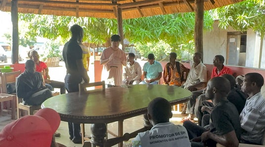 (モザンビークでの日本植物燃料合田社長(写真中央)と地元関係者による協議風景)