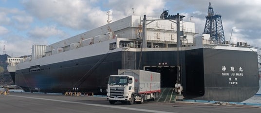 「RORO」は、Roll-On・Roll-Offの略で、貨物を積んだトラックやシャーシ(荷台)ごと輸送する船舶のことです。