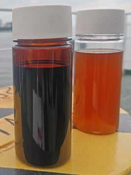 ジャトロファ由来SVOサンプル (右)SVO 100% (左)適合C重油に混合後の状態(バイオ燃料濃度10%)