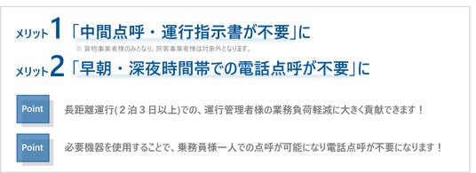 ☆長距離運行(2泊3日以上)での、【中間点呼】【運行指示書】が不要です(貨物事業者が対象)