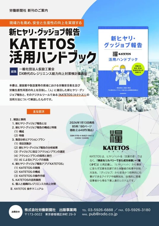 株式会社ダイサン(代表取締役社長:藤田武敏)は、一般社団法人仮設工業会と共同開発した現場DXアプリ「KATETOS(カテトス)」の活用方法をまとめた書籍『新ヒヤリ・グッジョブ報告 KATETOS活用ハンドブック』(編:一般社団法人仮設工業会「DX時代のレジリエンス能力向上対策検討委員会」)が、2026年1月13日(火)に発売されたことをお知らせいたします。