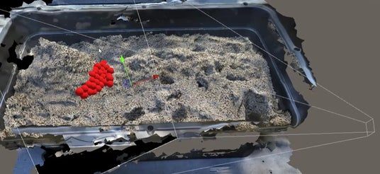 当社が開発した3次元モデル上にプロットするスペースプロット技術を用いて、水分が多く含まれる箇所の検出場所を赤い点として3Dモデル上にプロットした例