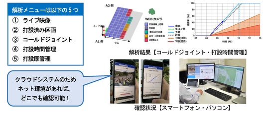 本システムは、熟練監督社員の減少や若年社員の経験不足による品質トラブルを未然に防ぐことを目的に開発されました。現場に設置したWEBカメラや各種センサにより作業状況を記録し、クラウド上の管理システムにて取得データのAI分析を実施。分析結果はグラフや図で可視化され、インターネット環境によりPCやタブレットなどのデバイスを通じてリアルタイムに確認できます。これにより、現場に加えて遠隔地からの支援が可能となり、打設の進行に応じた作業指示の精度向上や品質トラブルの未然防止につながります。