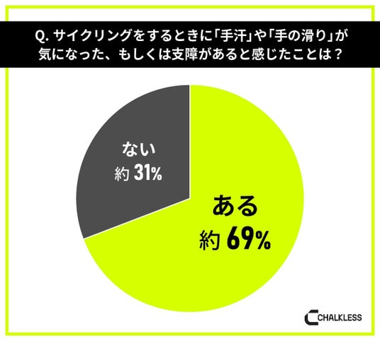 サイクリングの最中に手汗や滑りが気になった人は約69%と高い割合で手汗や滑りに関する悩みや課題感を持つ人がいることがわかりました。