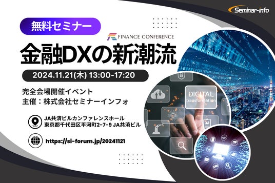 株式会社セミナーインフォ(本社:東京都千代田区 代表:小西 亘)は、2024年11月21日(木)にFINANCE CONFERENCE「金融DXの新潮流」を開催いたします。