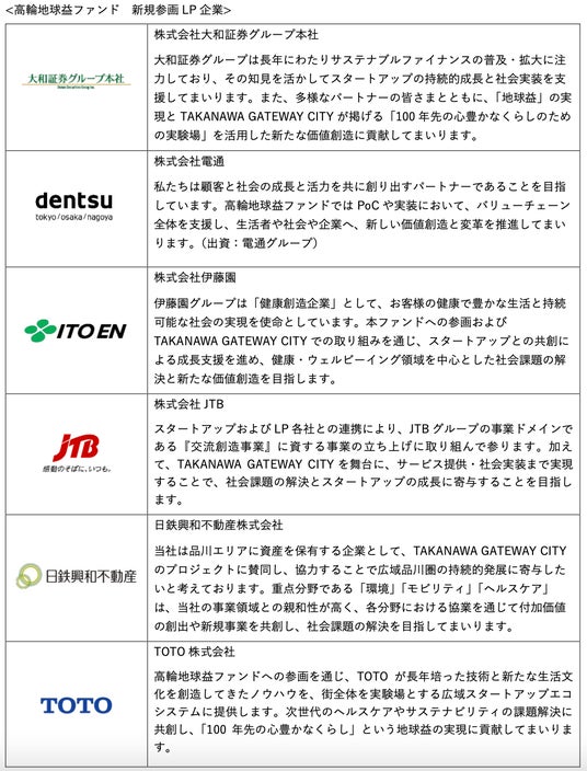 既存の「株式会社秋田銀行」「芙蓉総合リース株式会社」「三菱UFJ信託銀行株式会社」「株式会社西武ホールディングス」に加え、新たに「株式会社大和証券グループ本社」「株式会社電通」「株式会社伊藤園」「株式会社JTB」「日鉄興和不動産株式会社」「TOTO株式会社」が高輪地球益ファンドに参画しました。当社を含め、LP企業は計11社となりました。