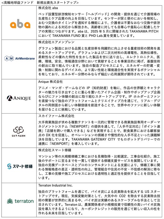 ・ 高輪地球益ファンド※3では、新たに6社を出資者として迎え、100億円を超えるファンドに拡大しました。当社を含む合計11社の出資者で、スタートアップの成長を強力に支援していきます。2024年12月の高輪地球益ファンド組成以降、計10社の多様なスタートアップに投資を実行しました。