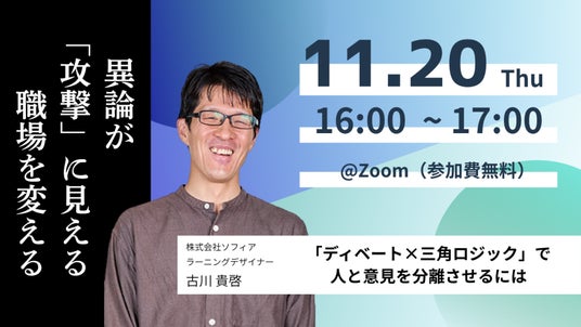 株式会社ソフィア(東京都港区麻布十番、代表取締役:廣田 拓也、以下ソフィア)は【11月20日(木)開催】異論が「攻撃」に見える職場を変える ~「ディベート×三角ロジック」で人と意見を分離させるには~と題し、無料セミナーを開催します。