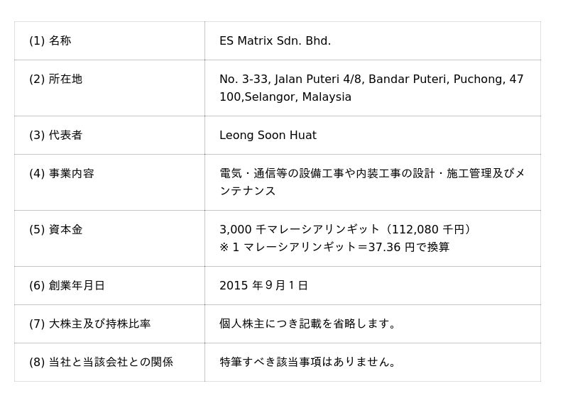 ES Matrix 社グループは、マレーシアを拠点とし、半導体やデータセンターなどの成長分野・産業を中心として電気・通信等の設備工事や内装工事の設計から施工、メンテナンスまでワンストップでサービスを提供しております。同社は、幅広いプロジェクトに関する豊富な経験を有し、その高い業務品質でマレーシア市場において確かな実績を築いております。また、現在は大型のデータセンターとAI テストラボに注力しており、当社の持つネットワークや技術的知見をES Matrix 社グループの強みに掛け合わせることで、同社の更なる成長に寄与いたします。