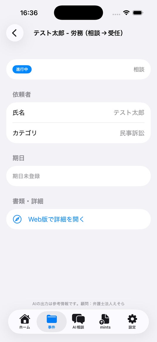 PIIマスキング機能については、Web版と同一のロジックをアプリにも実装しています。依頼者の氏名・住所・電話番号などの個人情報は、外部AIのAPIに送信される前に自動でマスキングされます。
