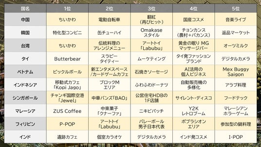2024年に各国で「なにがヒットしトレンドになったのか?」、現地ボードメンバーに対するヒアリングや実態調査を行い、TNCアジアトレンドラボで分析をして、上位5位のランキング形式にまとめた