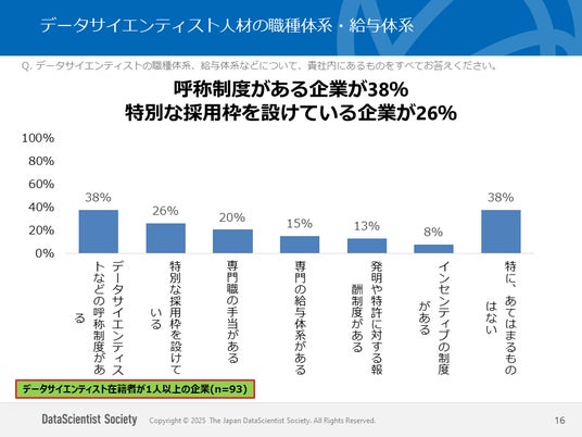 「2021年以来、3年ぶりに企業のデータサイエンティスト採用に関する調査を実施しました。今回の調査は、データサイエンティスト協会シンポジウムに参加した企業担当者に対して聴取しました。3年前と比べると生成AIの急速な普及のインパクトが大きく、今後増やしたいDS人材像として、統計やAIに詳しい人材(63%)やビジネス課題解決人材(61%)が高いなど、AIのビジネス活用が強く期待されていることが分かりました。また、シンポジウム参加企業においては社内研修制度を整えている企業が76%、データサイエンスに関する専門部署がある企業が81%と、データサイエンティストを育成する環境整備も進んできていると言えそうです。」