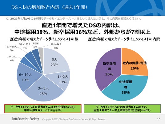 企業のDS採用意欲は依然旺盛で、外部からの採用意向も強い。増やしたいDS人材像は「統計やAIなどの理論に詳しい」が63%と最多。急速な生成AIの普及でAI活用に長けた人材が求められている。