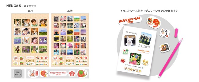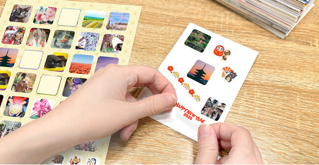 年賀フォトシールを使えば、市販の無地年賀状に貼るだけで、誰でも簡単に華やかな年賀状を作成できます。