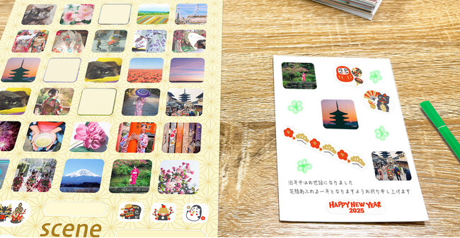 Sceneアプリから注文できる季節限定販売の「年賀フォトシール」は、台紙部分に干支や吉祥文様を描いた特別なデザインで、イラスト部分もはがして貼ることができる年賀状向けのシール商品です。