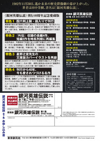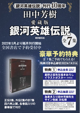 この『銀河英雄伝説』刊行40周年を記念した愛蔵版として、2022年、正伝を2作ごとにまとめ全5集に、また外伝全編を時系列順に再編して全2集に収め、四六判上製・函入りで刊行いたします。