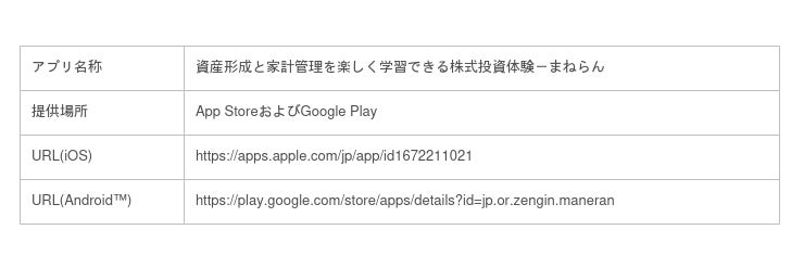 一般社団法人全国銀行協会(会長:半沢淳一 三菱UFJ銀行頭取)およびグリーンモンスター株式会社(代表取締役:小川亮)は、学んだ知識のアウトプットを意識した実践的な教育ツールとして体験型投資学習アプリ「まねらん」(経済的価値のないアプリ内通貨を用いた株式投資体験アプリ)をリリースいたしました。