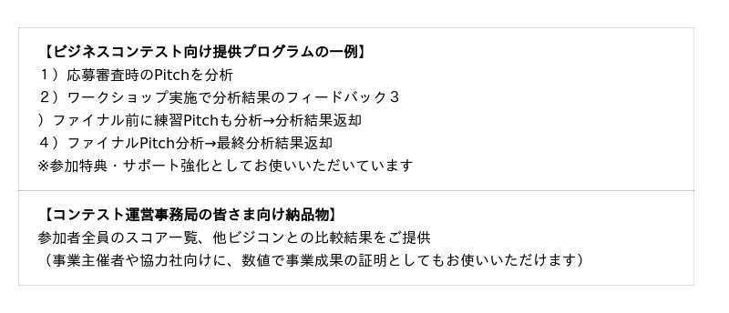 今後も、自治体・企業・大学等が運営する各種アクセラ/ビジネスコンテストに対し、「登壇者の改善に直結するフィードバック」として分析提供を拡大してまいります。