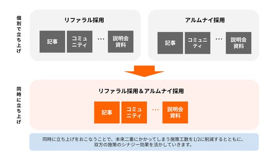当社の提供する「アルムナイ採用とリファラル採用の同時立ち上げサービス」においては、個別で立ち上げるときと比較して、工数を約半数に抑えながら、シナジー効果を最大化していきます。