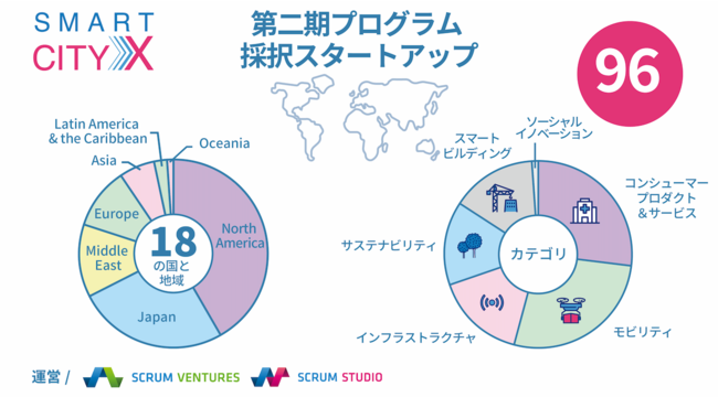 この度、その中から、『SmartCityX』の事業開発プログラムにご参加いただく「パーティシパント」として、新たに64社を採択しました。この結果、一期目から継続してプログラムに参画する「パーティシパント」32社と合わせて、世界18の国と地域から96社のスタートアップが大企業との事業共創を開始します。