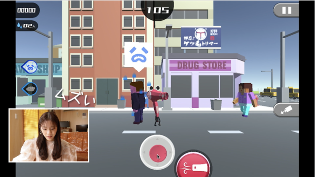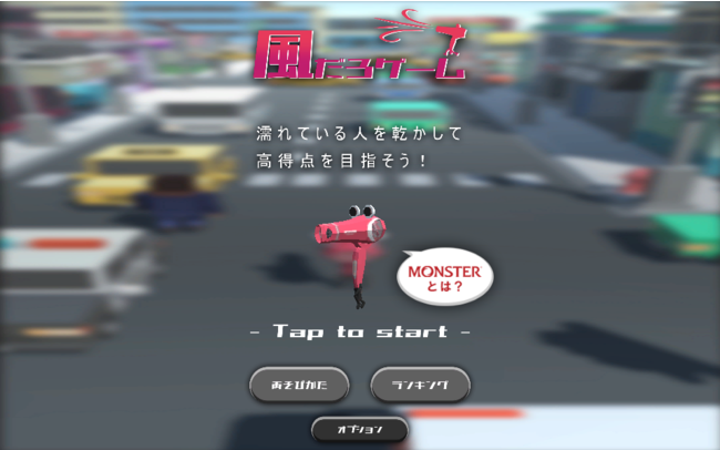 そんな雨に濡れた人々を、ダブルファンドライヤー「MONSTER」の爆風で、ひたすら乾かしていく「おせっかい」でシュールなゲーム。乾かして喜んでもらった人の数だけポイントが溜まり、ゲーム終了後にGETしたポイントがランキング形式で表示されます。みなさんは、貴島さんの人数を超えることができるか!?街には、何かをつぶやく人や隠し看板などもあるので、その秘密も探してみてくださいね。