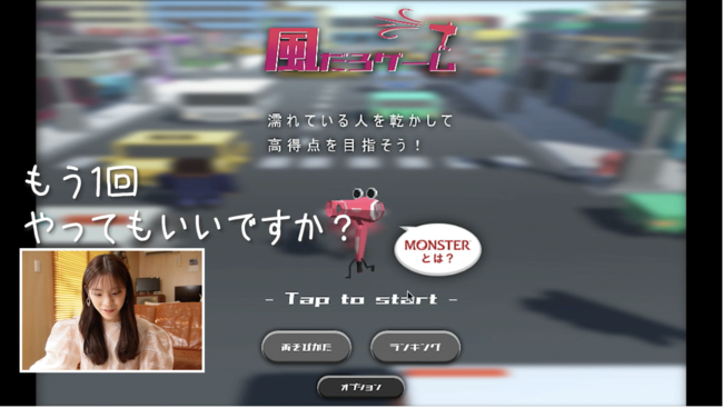 「なんでゲームを作ったのw?」と突っ込みながらも、プレイスタート!シンプルだけど、意外にムズい!とゲームに悪戦苦闘。貴島さんは果たして何人の髪を乾かすことが出来たのか!?プレイ中の貴島さんのキュートな姿も必見です!また、ただいま、「風だろ!ゲーム」をプレイして結果を投稿するとMONSTERが当たるキャンペーンも実施中!みなさん、この機会にぜひ、貴島さんを超えるスコアにチャレンジしてください!
