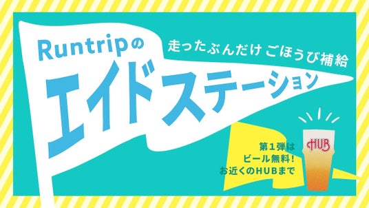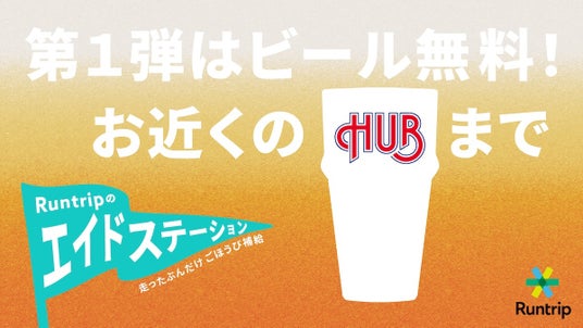 「Runtripのエイドステーション」第1弾は、全国の88店舗の「HUB」を対象とした『キリン一番搾り3/4パイントグラス(660円相当』)が1杯無料になるクーポンを提供いたします。
